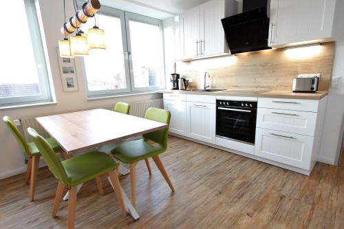 Im Wohnzimmer befindet sich eine gemütliche Couchecke und die voll ausgestattete Küchenzeile u.a. mit einem Geschirrspüler, Backofen mit Ceranfeld und vielen weiteren Küchenhelfern.