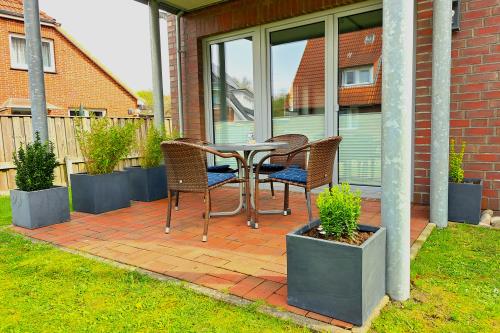 Hochwertig ausgestattete Ferienwohnung, 55 m², mit Gartenanteil und Terrasse, eine Wohnküche mit Essgelegenheiten. Wohnküche mit bequemer Couch und Flachbildfernseher, ausgestattete Einbauküche mit Cerankochfeld, Backofen und Geschirrspülmaschine, Kaffeemaschine und Wasserkocher. Ein Schlafzimmer (Doppelbett, mit TV-Flachbildschirm), ein Schlafzimmer mit einem weiteren Doppelbett, modernes Bad mit Dusche und WC, Terrassenmöbel mit Auflagen, Waschmaschine und Trockner im Keller vorhanden.
