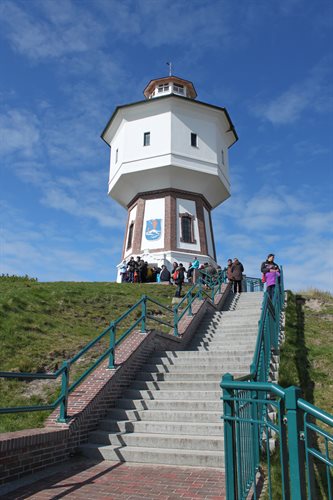 Im Erdgeschoss des Turms befindet sich eine kleine Ausstellung „100 Jahre Wasserturm - 100 Jahre Wasserversorgung“ und die Aussichtsplattform mit Rundumsicht ist über eine Metallwendeltreppe zu erreichen. Von dort hat man einen tollen Ausblick über die ganze Insel bis hin zum Festland und zur Hauptschifffahrtslinie. So können Sie häufig beobachten, dass ein Fahrgast bei der Anreise mit dem Schiff den Wasserturm am Horizont erkennt und ihn als Leuchtturm bezeichnet. Ebenso häufig findet sich ein ortskundiger Fahrgast der darauf hinweist, dass es sich um einen Wasserturm handelt, der keine Befeuerung hat und lediglich bei Tageslicht ein weithin sichtbares Seezeichen ist.